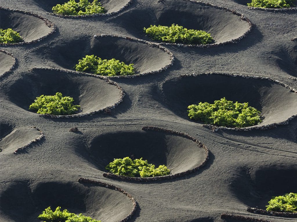 Las viñas se cultivan en hoyos, conocidos como ‘rofe’, que están excavados en la ceniza volcánica. Este sistema permite que las plantas capten la humedad del aire y de la lluvia.